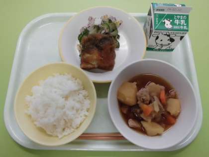 今日の給食は、ごはん、牛乳、揚げ魚のみぞれだれ、ゆかり和え、豚肉とじゃがいもの南蛮煮です。