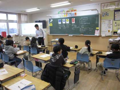 道徳の時間です。車いすなどのマークから、マークを見かけたらどんなことができるか考えていました。