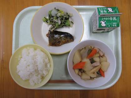今日の給食は、ごはん、牛乳、にしんの昆布煮、磯和え、筑前だきです。