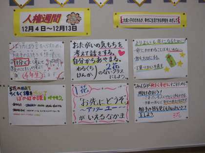 先週4日から人権週間です。職員室前には、各学年の目当てを掲示し、みんなで声を掛け合い、意識して取り組んでいます。また、図書室前には人権に関する本が紹介されています。この機会にぜひ借りて読んでみましょう。