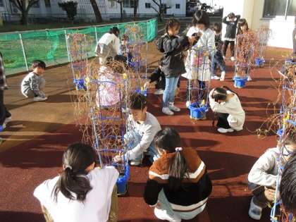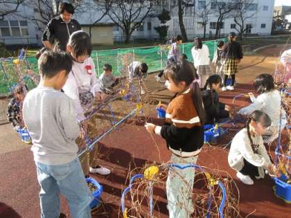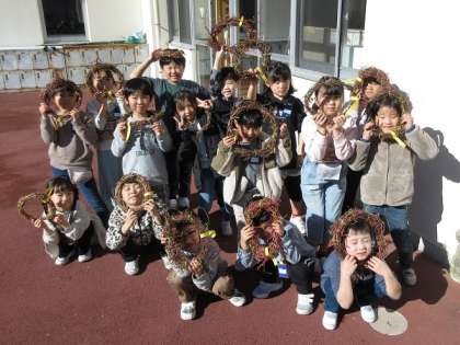 2年生が昨年の経験を基に手伝ってくれました。丸いリースができあがり、とてもうれしい1年生でした。後日、クリスマスバージョンに飾り付けをするのが、楽しみです。