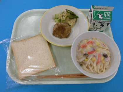 今日の給食は、減量食パン、牛乳、鶏つくね、切干大根のサラダ、クリームスパゲッティです。