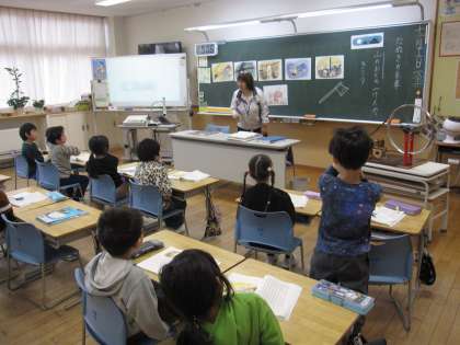 国語「たぬきの糸車」の学習です。「きこりって何をする人ですか?」「おので木を切るよ」「おのって知ってる?」「道徳の『金のおの』で出てきたよ」