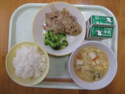 今日の給食は、ごはん、牛乳、豚肉のジャンロー、ゆでブロッコリー、かき玉汁です。