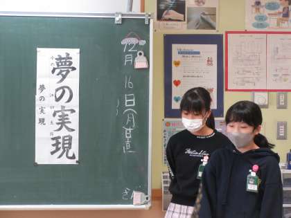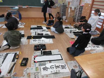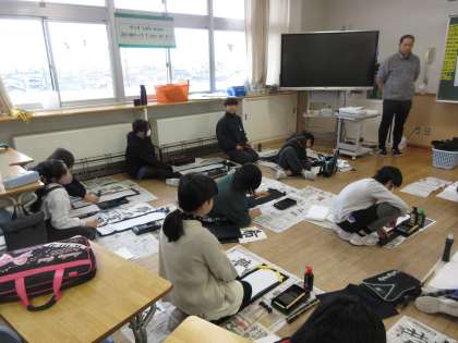 今日は、授業の初めに書道の得意な友達に、書くときのポイントを教えてもらいました。それから、それぞれ自分の作品に真剣に取り組んでいました。