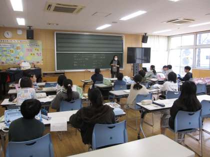 音楽で「名探偵コナン」のテーマ曲を合奏します。楽器を分担していました。