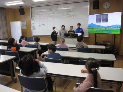 5年生は総合的な学習の時間に「『米』調査隊〜米のひみつを発見しよう〜」をテーマに学習してきました。学習のまとめとして、いきいきタイムに全校に呼びかけ、お米についてスライドや劇で発表したり、スマート農業についてクイズスタンプラリーを開いたりしました。