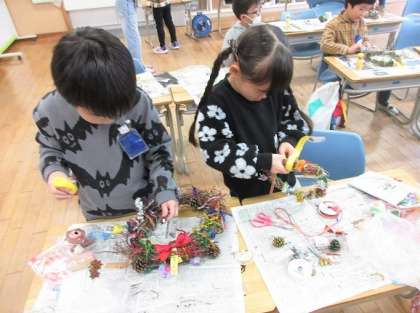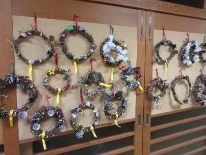 あさがおの蔓でつくったリースに、飾りを付けました。きらきらモールの他に、秋の宝物の松ぼっくりやどんぐりを、金や銀、緑に着色し、ホットボンドでリースに付けました。子供の中には、家で見付けたキャンディーのきらきらな包み紙や綿等、飾りに使えそうな物を持ってきて、賑やかに飾っていました。大切なあさがおがきれいなリースになり、とても喜んでいました。