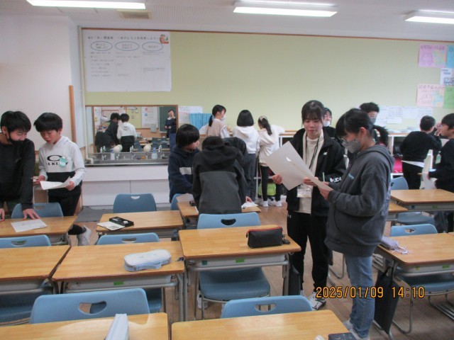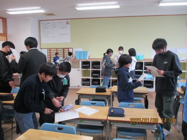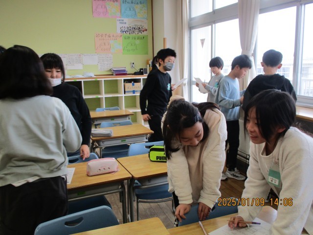 学級活動で「冬休みBINGO」をしました。BINGO用紙に書かれた「お正月におもちを食べましたか?」「家のそうじをしましたか?」などをペアを変えながら聞き合い、友達と楽しく関わることができました。