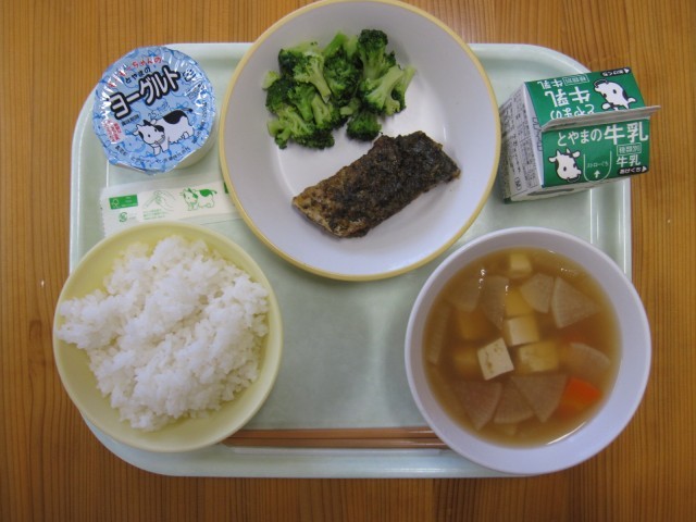 今日の給食は、ごはん、牛乳、しいらのえごまだれ、ゆでブロッコリー、すいとん、ヨーグルトです。