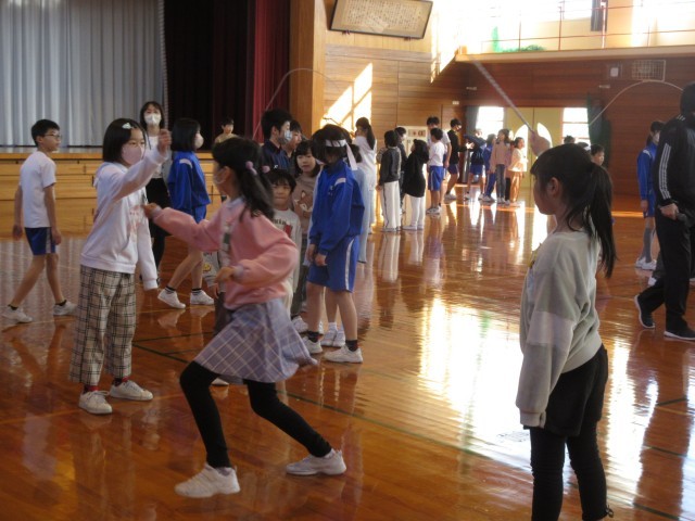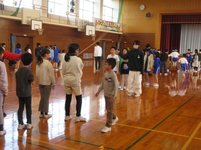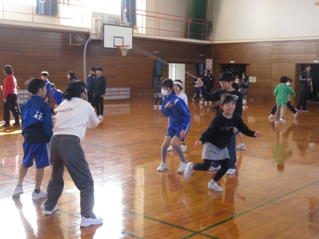 今日から大縄の練習が始まりました。高学年が中心となり、ファミリー班で八の字跳びを行います。まずは縄の中に入り、ジャンプするところからです。