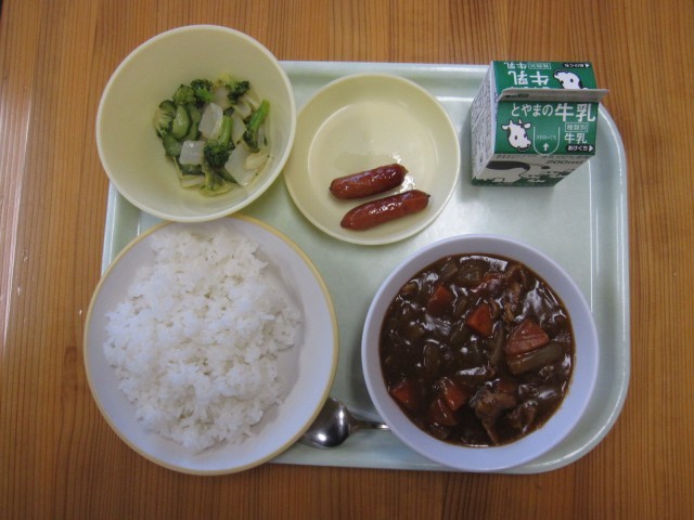 今日の給食は、ごはん、牛乳、ハヤシライス、あらびきウインナー、グリーンサラダです。