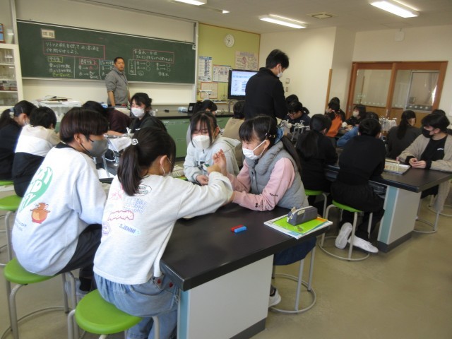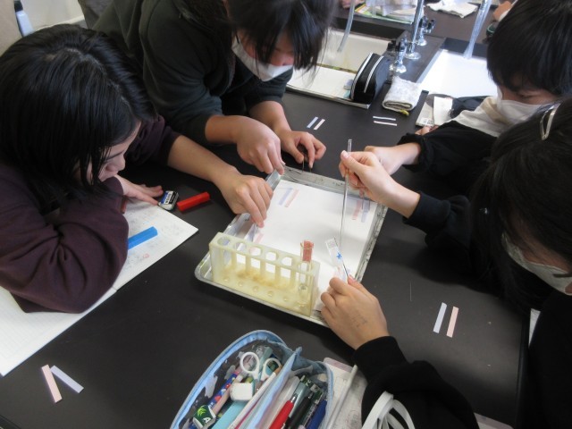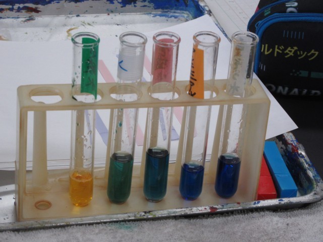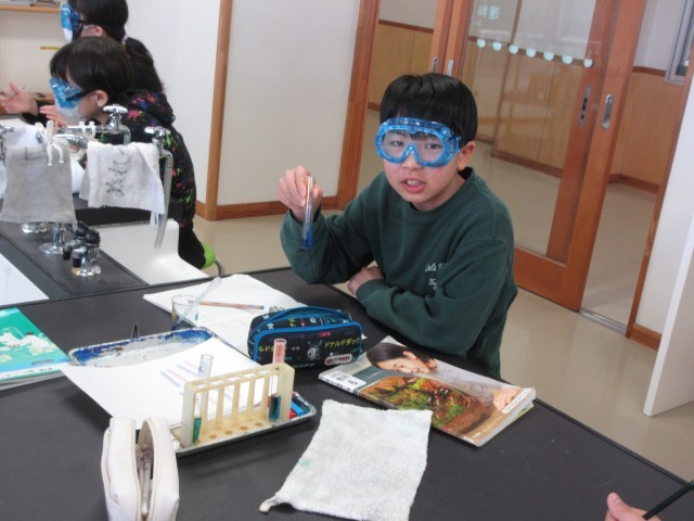 今日はリトマス紙やBTB溶液を使って、水道水、食塩水、うすい塩酸、うすいアンモニア水、炭酸水、重曹水がアルカリ性、酸性、中性のどれなのかを実験しました。同じアルカリ性でもBTB溶液の色の濃さに違いがあることにも気づいていました。