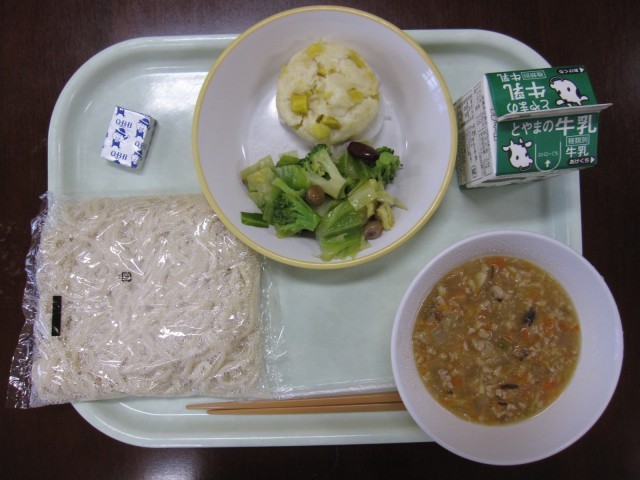 今日の給食は、ソフト麺の肉味噌、牛乳、蒸しパン、ビーンズサラダ、ポケットチーズです。