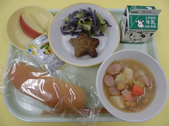 コッペパン、牛乳、星形ハンバーグ、サイエンスサラダ、根茎葉のポトフ、りんごです。