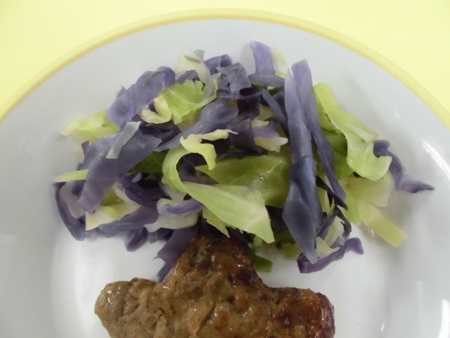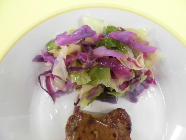 サイエンスサラダの紫キャベツには、「アントシアニン」という色素が含まれており、酸性・アルカリ性で色が変わる性質があります。レモンドレッシングをかけて、色の変化を楽しみました。