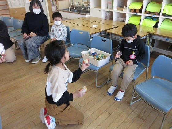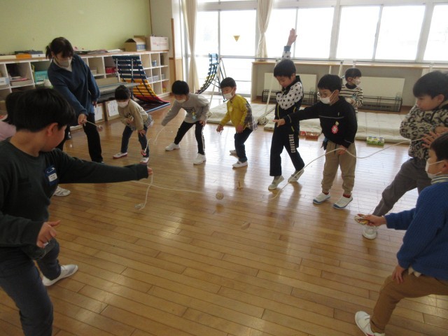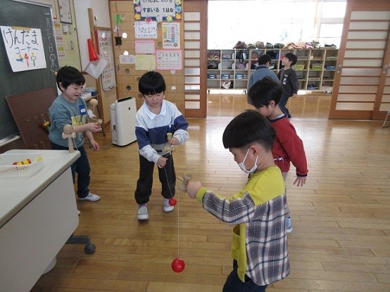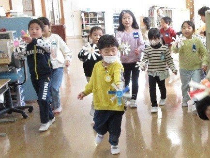 今日は、水橋幼稚園のお友達と一緒に、生活科で取り組んできた「こま回し」や「お手玉」等の昔遊びを楽しみました。1年生が幼稚園のお友達に、手を取りながら教えたり、けん玉等はやりながらこつを教えたりしていました。最後に、1年生が紙コップで作った風車を一緒に回し、おみやげとしました。遊びを通して関わる姿はとてもほほえましく、どの子供も笑顔できらきらしていました。