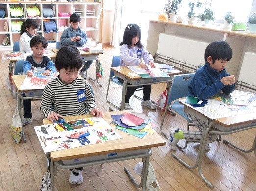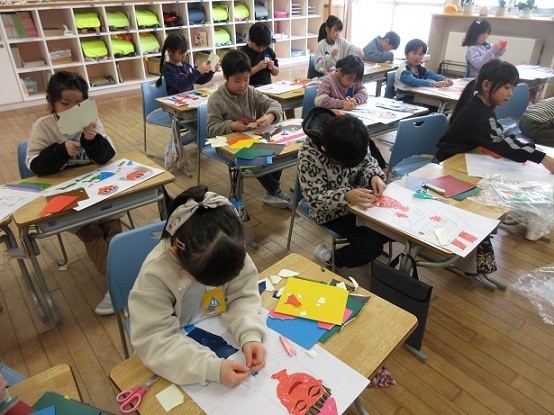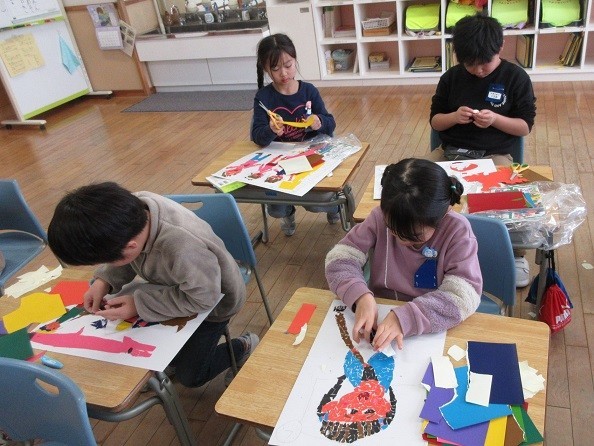 図画工作科「1年生の思い出を版画で表そう」の学習で、子供たちは1年間の出来事をふり返り、心に残っている場面を絵で表しました。版画として表現するのは初めてですが、色の付いた紙を細かくちぎり、集中して丁寧に貼り付けていました。刷り上がりを楽しみにしています。