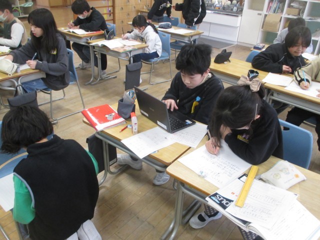 国語科では、話す・聞くの学習をしています。4年生で学習したことを思い出し、アンケートや資料をつくっていました。発表に向けて役割を分けてがんばっています。