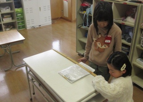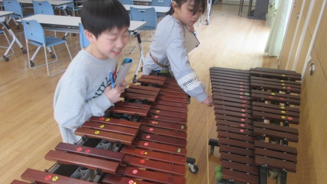 算数科「ながい長さのたんい」の学習では、身近にある1mのものを予想し、1mものさしを使って調べました。ロッカーや配膳台、黒板など様々なものをペアで協力して測り、ノートにまとめていました。