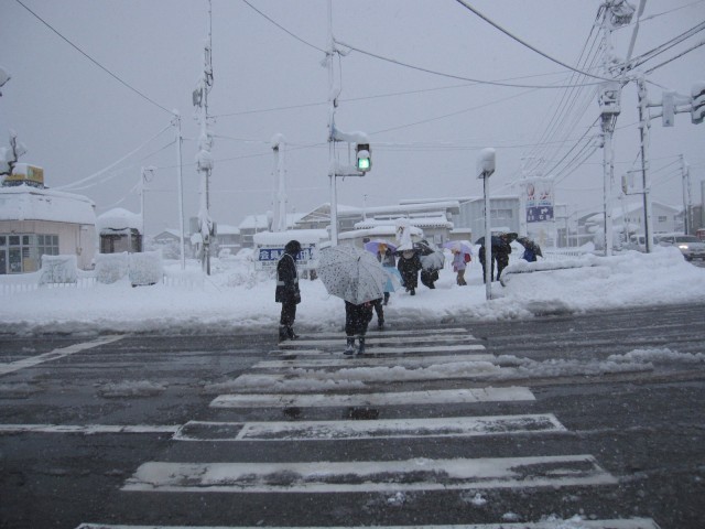 通学路の歩道であいていないところがあり、やむを得ず、車道を通ってきた子供もいます。下校時刻は予定通りです。子供たちに雪道等の歩き方を指導し、教員が交差点等に立ち、見守ります。よろしくお願いします。