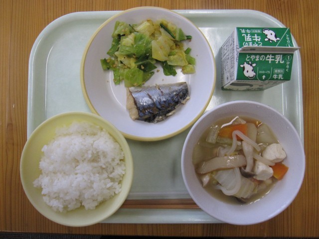 今日の給食は、ごはん、牛乳、鯖の味噌煮、いり大豆和え、ちゃんこ鍋です。