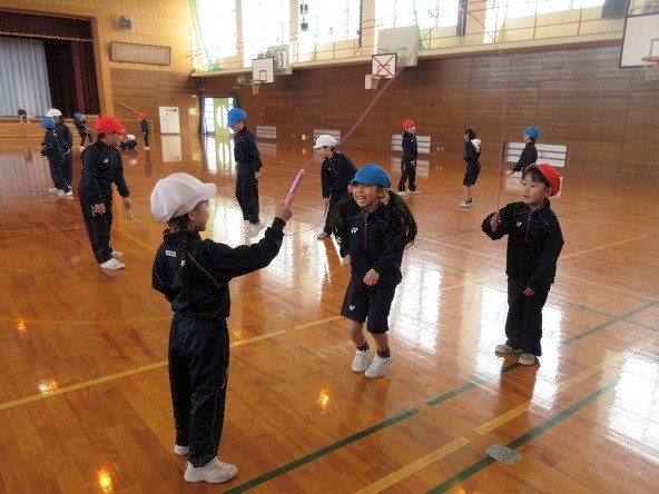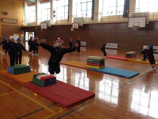 体育科「跳んで、降りて、跳び箱遊び」の学習を始めました。まず、一人で跳ぶ縄跳びで体を温め、3人グループで「郵便屋さん♪」を楽しみ、それから、跳び箱遊びに取り組みました。思い切り踏み切って、上に乗り、高くジャンプして降りたり、横に手を当てて横跳びをしたり、足を開いて跳び越し(開脚跳び)たりと、思い思いの跳び方をしてみました。これから、いろんな跳び方にチャレンジしていきます。