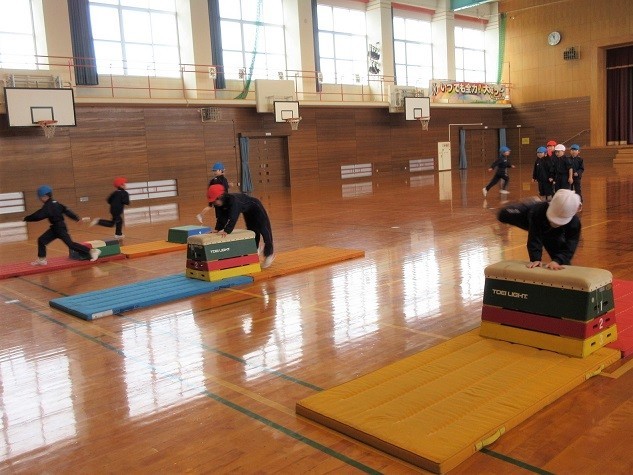 体育科「跳んで、降りて、跳び箱遊び」(1年生)