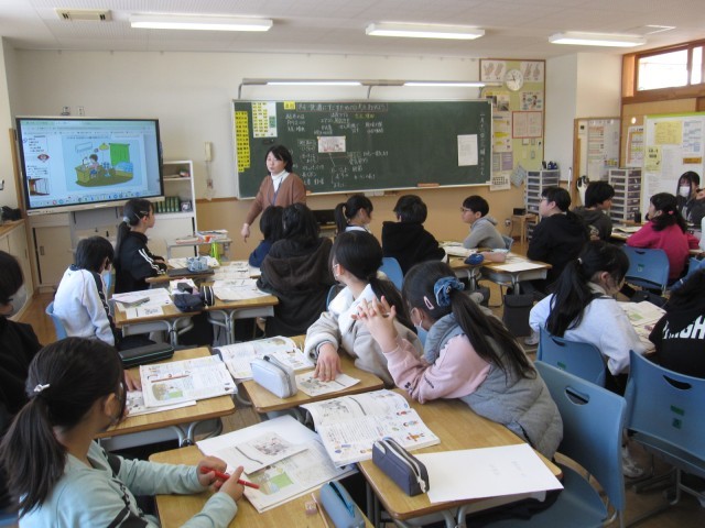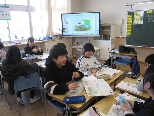 家庭科の時間です。これまで寒い冬を快適に過ごす工夫を学習してきました。きょうは今までの学習を振り返り、絵を見て改善点を考えました。ぜひ、家でも実践してみてください。