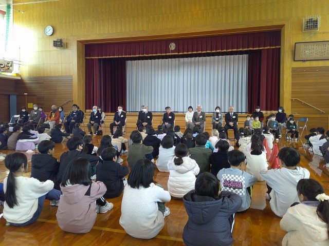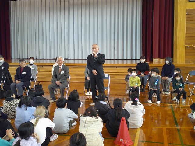 日頃からお世話になっている地域の方々をお招きし、感謝の集いを開きました。お越しいただいた方々から、お一人ずつ、地域でどんなことをしているのか、またどこの担当町内なのかなどお話していただきました。子供たちはしっかりとお話を聞いていました。