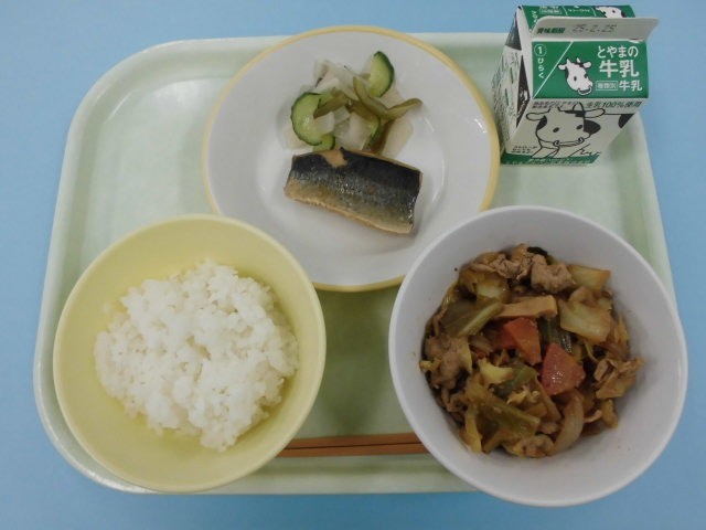 今日の給食は、ごはん、牛乳、にしんの生姜味、茎わかめの酢の物、回鍋肉です。