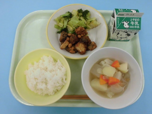 今日の給食は、ごはん、牛乳、鱈と大豆の甘からめ、グリーンサラダ、ポトフです。