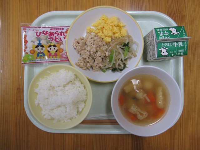 今日の給食は、二色丼(鶏そぼろ・炒り卵)、牛乳、青菜ひたし、白玉汁、ひなあられです。