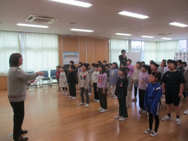 1~3年生が主旋律を歌います。口をしっかり開けて6年生に感謝の気持ちが伝わるように練習しました。