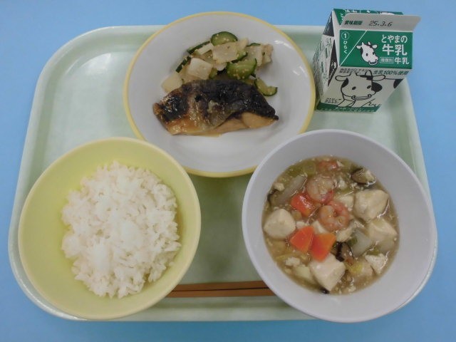 今日の給食は、ごはん、牛乳、ふらぎの西京焼き、華風和え、えびと豆腐のうま煮です。