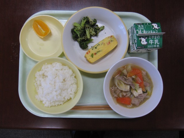 今日の給食は、ごはん、牛乳、千草焼き、ブロッコリーのごまだれ、韓国風すきやき、清見オレンジです。