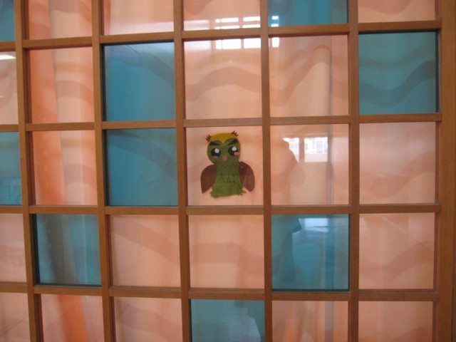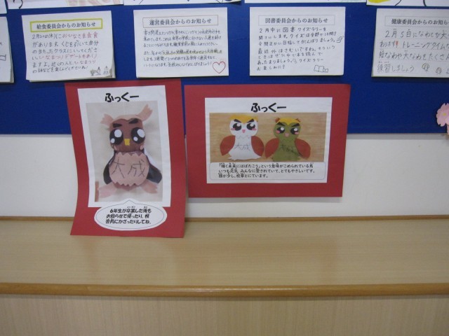 6年生が中心となり本校のキャラクターを考え、全校で投票して決めました。きのうの児童会引き継ぎ式の時に紹介されました。名前は「ふっくー」です。今朝いろいろな場所で見かけました。大成っ子のことを見守っているようです。