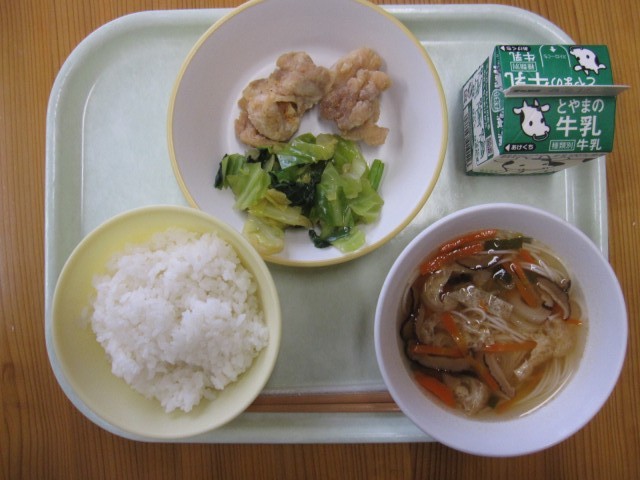 今日の給食は、ごはん、牛乳、鶏肉のから揚げ、おひたし、にゅうめんです。