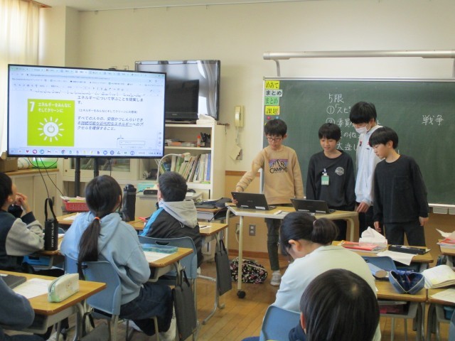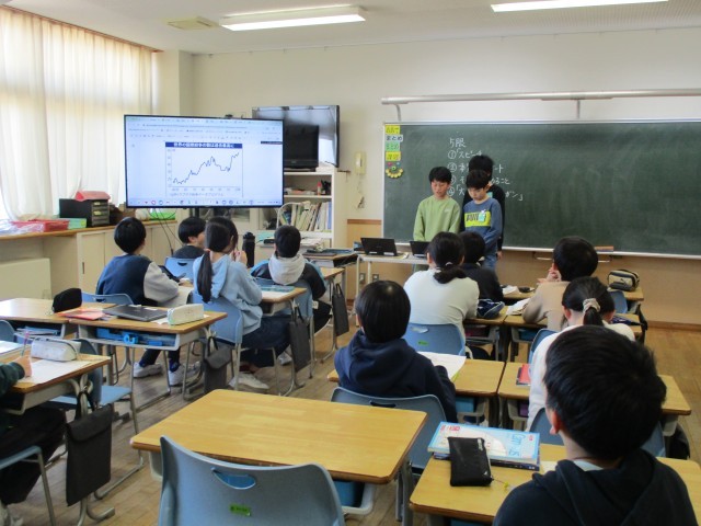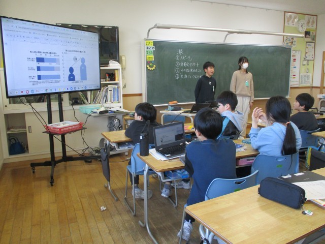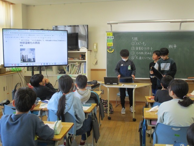 「子ども未来科で何をする」という学習で、自分たちが未来のために学んだらよいことについて提案するスピーチをしました。調べたことをもとに事実と意見を区別することに気をつけ、資料を提示しながら発表しました。子供たちはグループの友達と協力して、しっかり自分たちの考えを提案することができました。