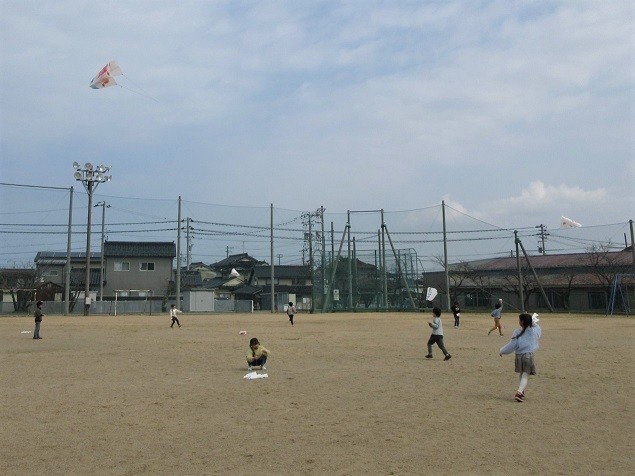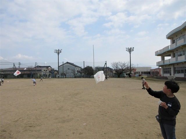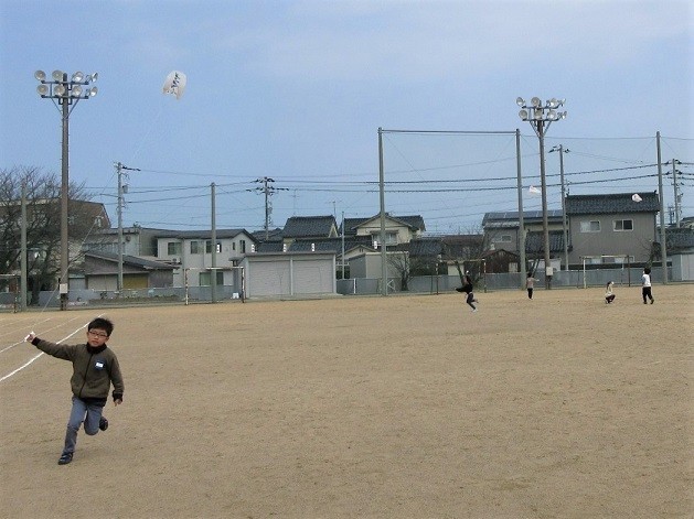 生活科「かぜであそぼう」の学習で、凧揚げをしました。今日は、とてもさわやかな風が吹いており、走らなくても凧が揚がる瞬間があり、子供たちは風を受ける手応えを感じ取り、歓声を上げていました。風が収まったときは、一生懸命走って揚げる楽しさも味わいました。