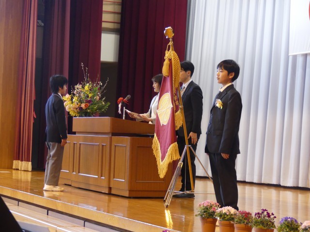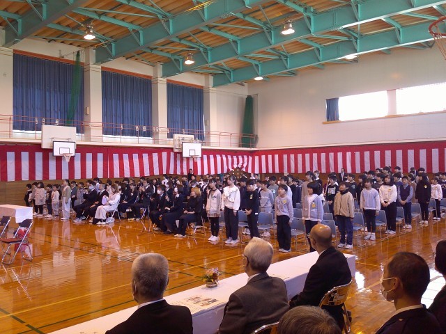 天気に恵まれた本日、令和6年度卒業式が行われました。緊張の面持ちで式に臨んだ卒業生たちは一人一人真剣に卒業証書を受け取りました。門出の言葉では、卒業生、在校生ともに感謝や激励の言葉を心を込めて交わしました。それぞれの合唱も練習で意識してきたことを念頭に、心を込めて歌いました。最後に、卒業生がこれまで育てていただいた感謝の気持ちを込めて、保護者に花束を手渡しました。今年度の全校児童がそろって校歌を歌い上げ、会場を後にしました。