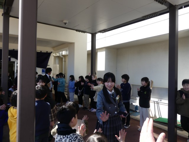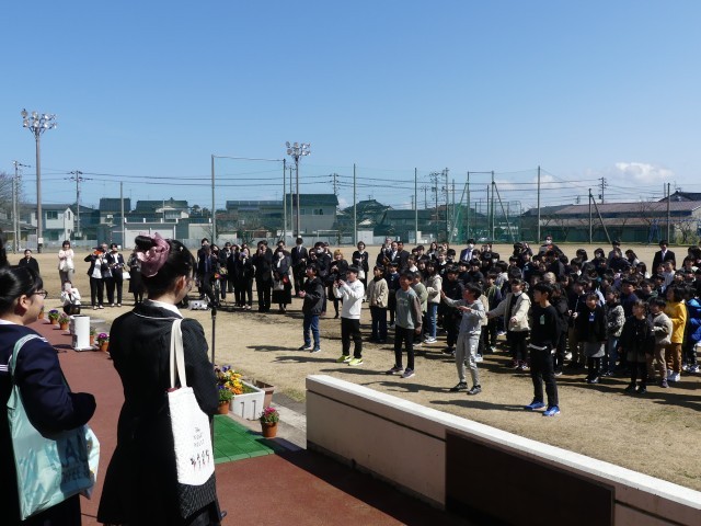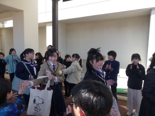 卒業式後、教室に戻り、6年生は担任や友達との最後の時間を過ごしました。その後玄関前で巣立ちの会が行われました。卒業生、在校生が互いにエールを送り合った後、地域の方々や職員の方々、在校生と最後のお別れをしました。