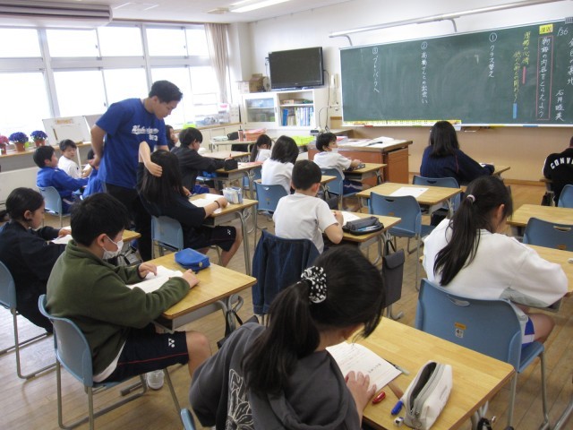 国語の時間です。最初の物語文「銀色の裏地」というお話です。一人一人がじっくりと教材文を読んでいました。
