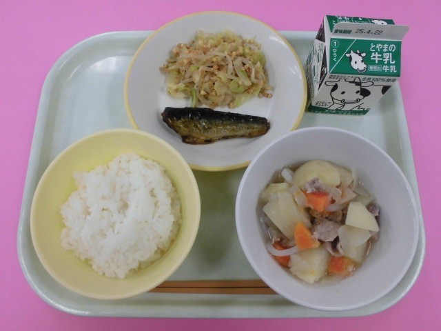 今日の給食は、ごはん、牛乳、いわしの梅煮、いり大豆和え、塩肉じゃがです。