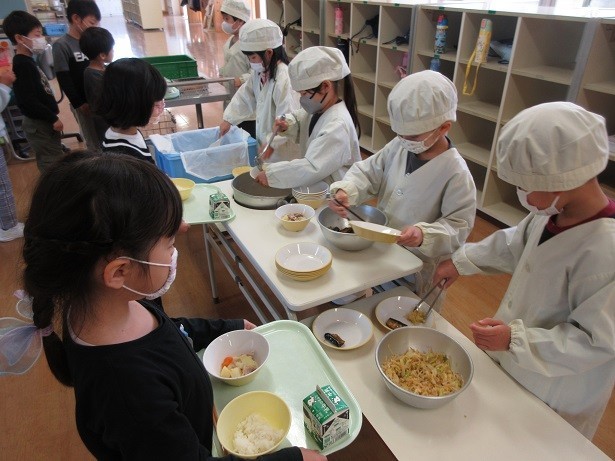 初めて学校で給食をいただいた日は、6年生に準備のお手本を見せてもらいました。