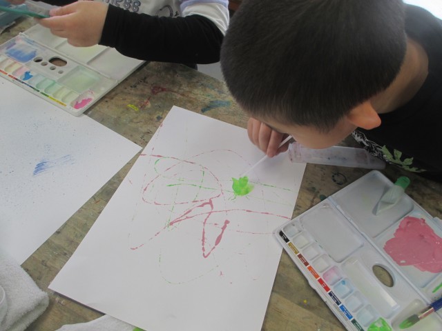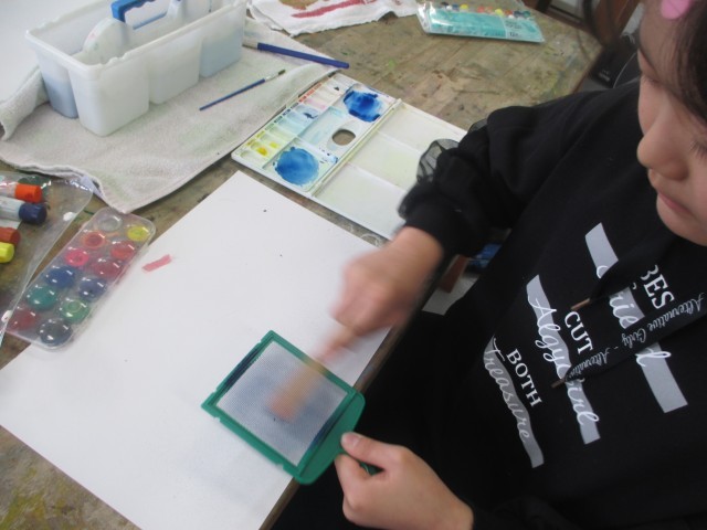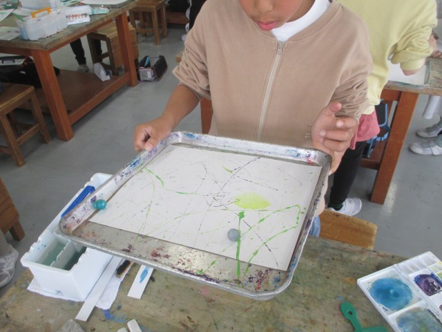 絵の具をつけたビー玉をトレイの中で転がしたり、色水を垂らしたところにストローで息を吹きかけたり、金網で絵の具を付けたブラシをこすったりして、いろいろな模様ができるのを楽しみました。今日は、色の組み合わせや水の量を調整することが中心の活動になりましたが、次回は、この経験を生かしてもっと素敵な表現にしようと工夫できたらと思います。