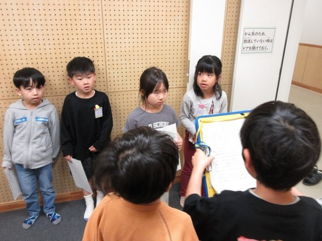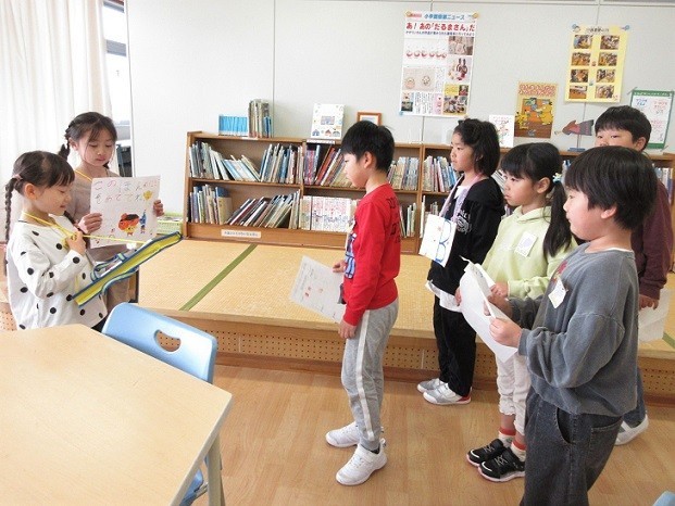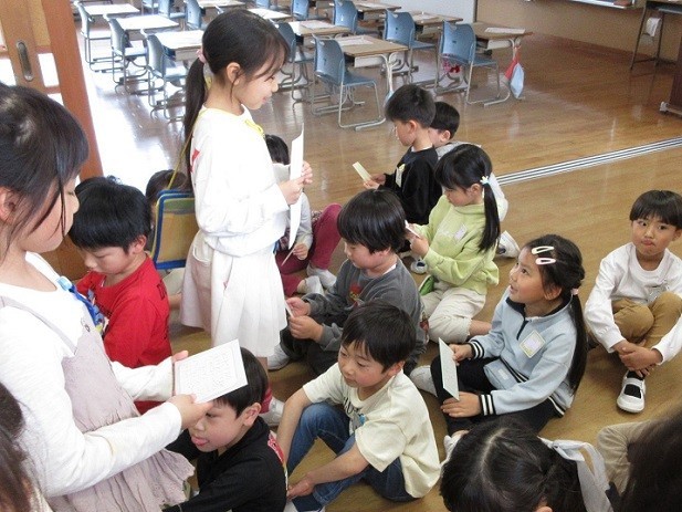 各階にいろいろな部屋があることを知ってもらうために、グループをつくって案内しました。それぞれの部屋では、クイズ係がクイズを出し、1年生さんに楽しんでもらうことができました。みんな回った後、昨年度育てたあさがおの種をプレゼントしました。これから、もっともっと1年生さんとなかよしになりたいと思っています。