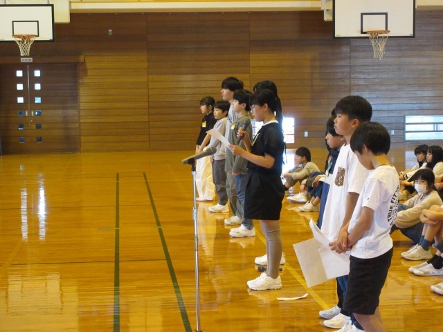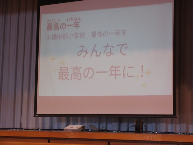 先週金曜日に児童会発足式がありました。児童会のスローガンや各委員会の目当てが紹介されました。今年度の児童会のスローガンは、「最高の一年 笑顔あふれる 大成のラストピース」です。水橋中部小学校の最後の一年を思い出に残る最高の一年にしましょう。