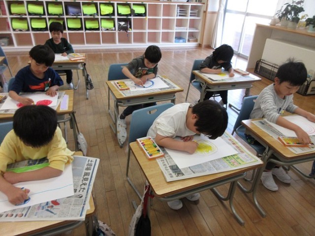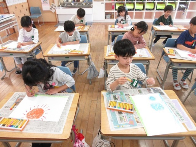 図画工作科の時間に、「にこにこおひさま」を描きました。一人一人がすてきなお日さまを想像し、その周りにいろいろな生き物が集まっている楽しい絵です。色や形、表情等を工夫した自分だけのお日さまを学習参観で披露します。