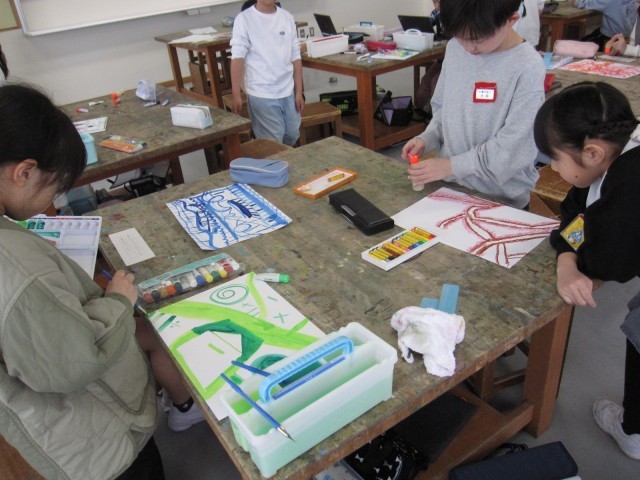 図工の時間です。春の花を描いたり、筆でいろいろな線を描いたりしていました。